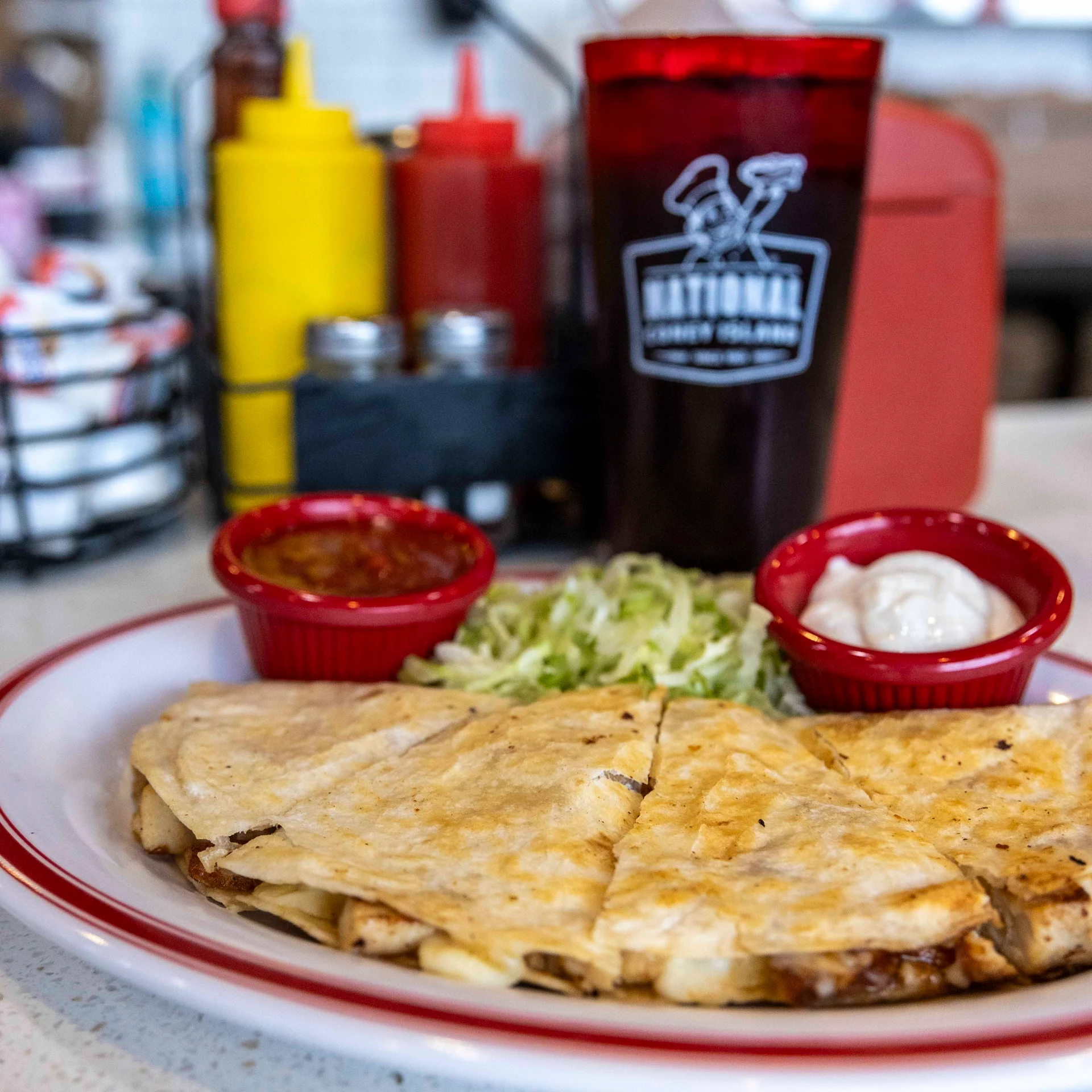 Grilled tortilla with chicken and mozzarella cheese. Served with sour cream and salsa.