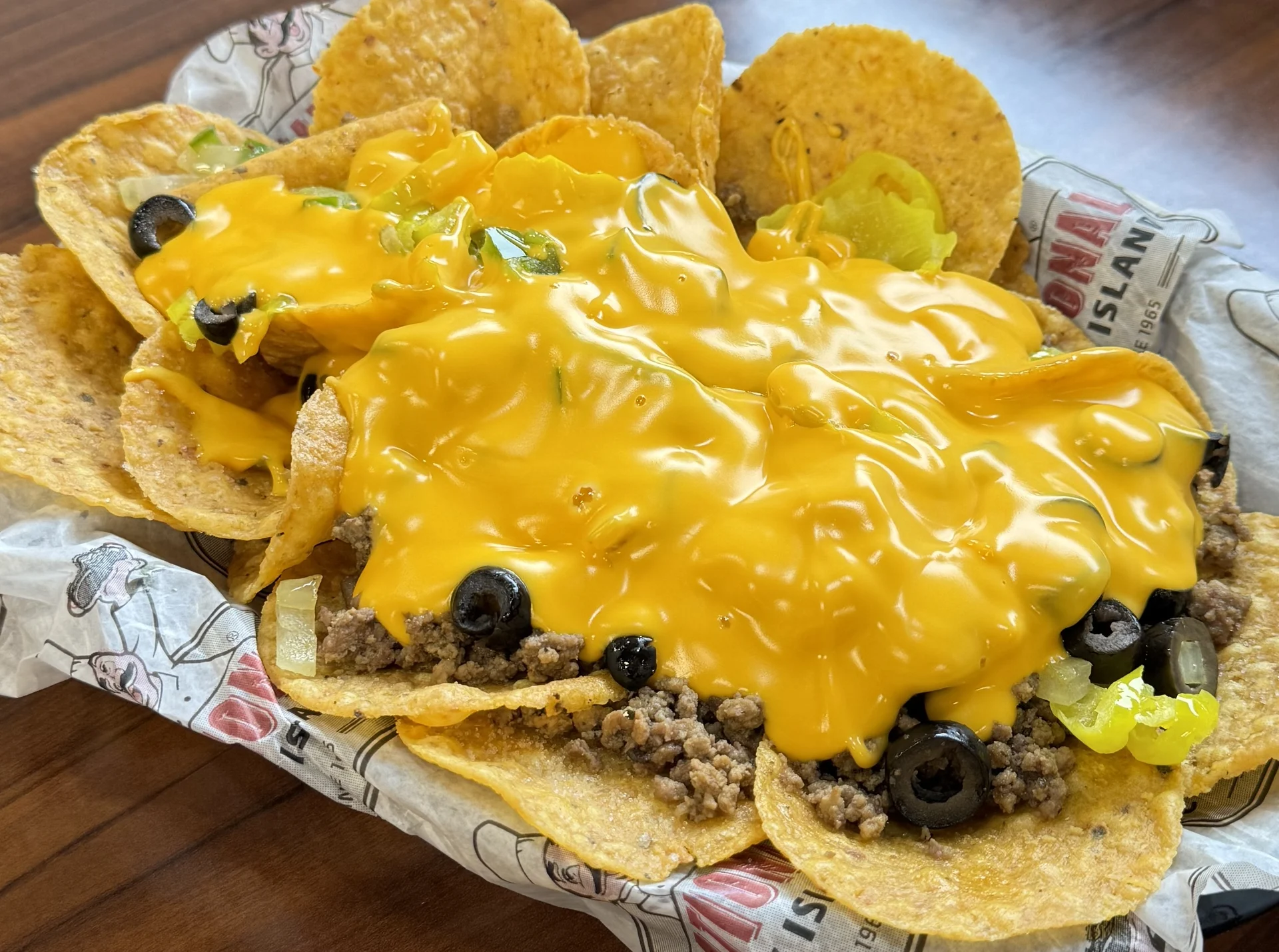 Seasoned ground beef, grilled onions, green peppers, black olive slices and ring peppers smothered with cheese sauce on a bed of tortilla chips. Served with salsa and sour cream.