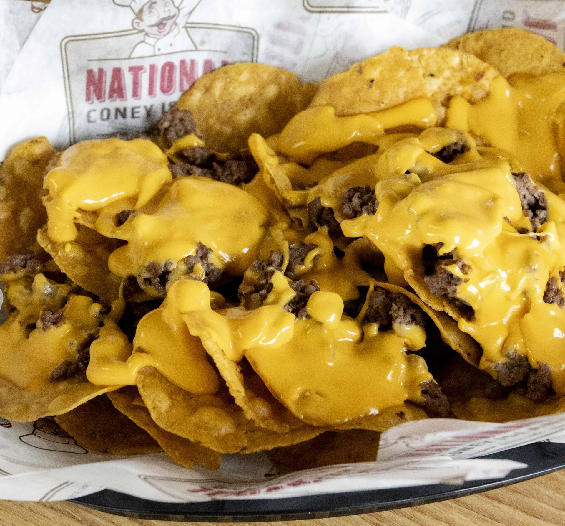 A bed of tortilla chips, seasoned ground beef, smothered with cheese sauce. Served with sour cream and salsa.