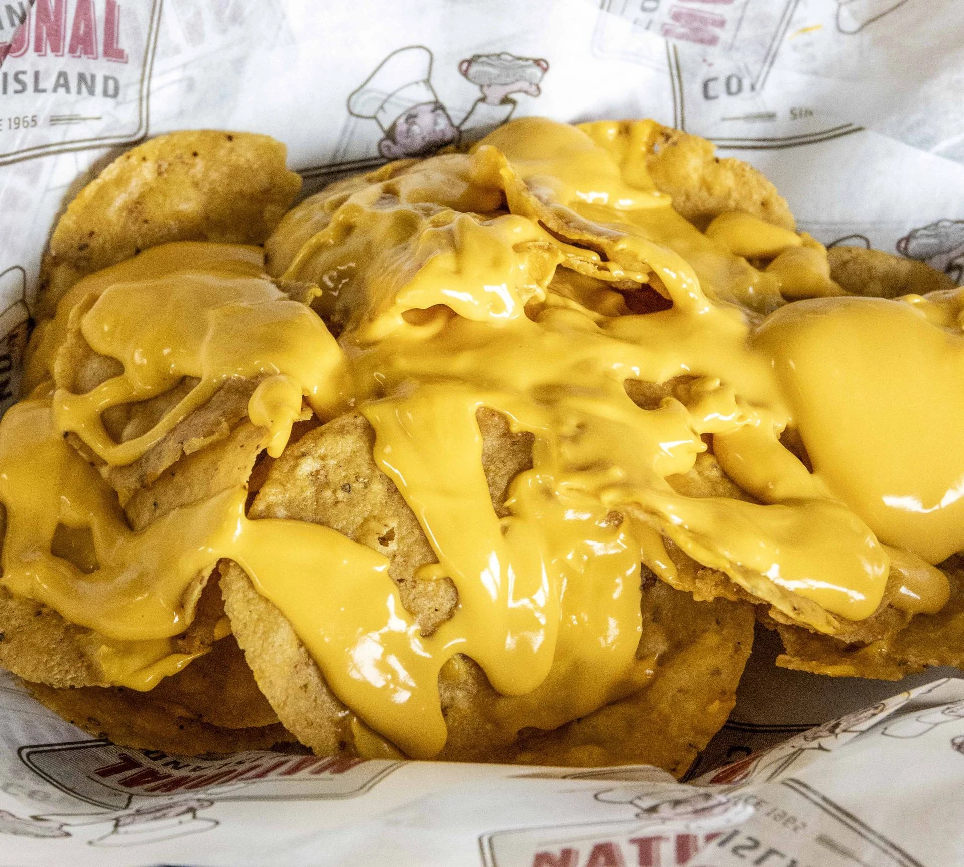 A bed of tortilla chips smothered with cheese sauce. Served with sour cream and salsa.